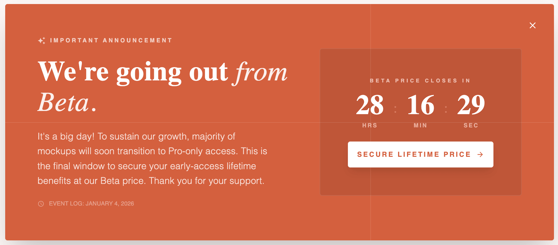 Hey there! It’s been a while, but big news: we’re officially going out of Beta. To sustain our growth, majority of mockups will soon transition to Pro-only access. To celebrate (and to thank our early users), we’ve added a countdown banner on the site with a final chance to lock in the Beta lifetime price before the new pricing takes effect. If you’ve been meaning to upgrade, this is the moment. Thank you for being part of the journey 💛 Check out Pro Got an idea or feedback for us? Drop a...